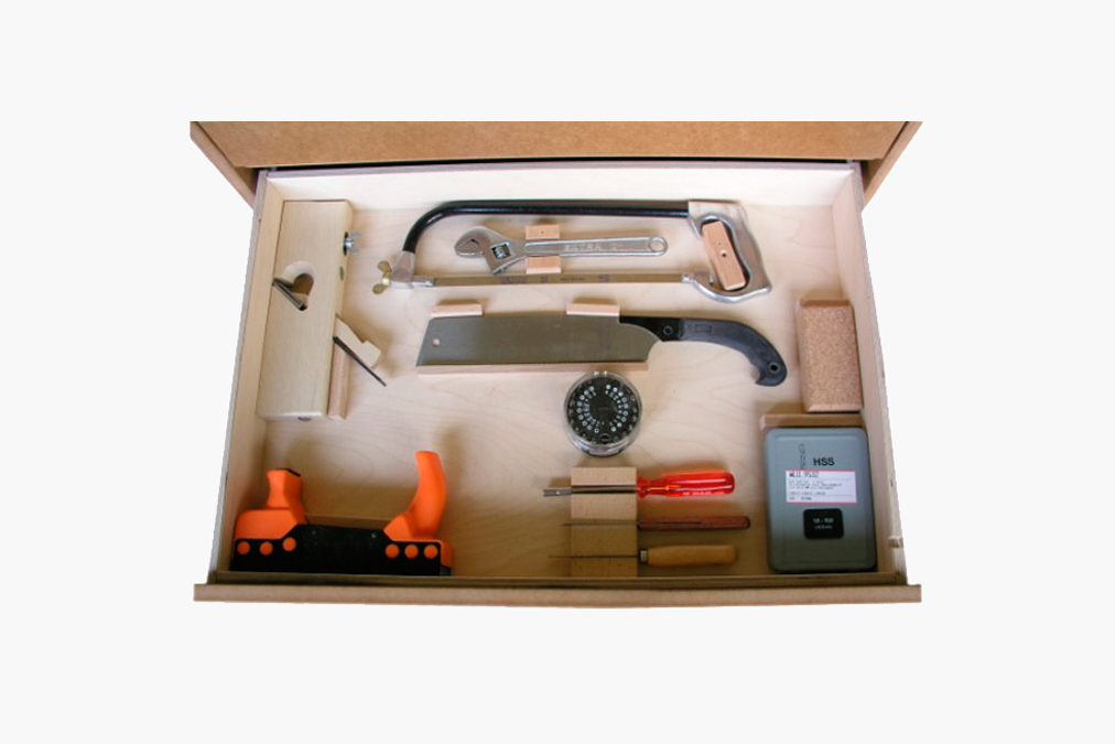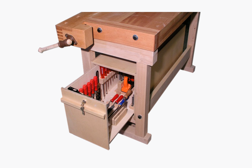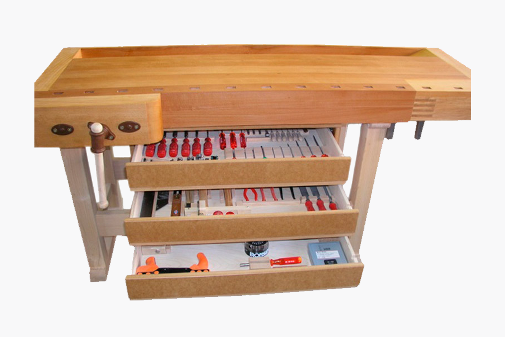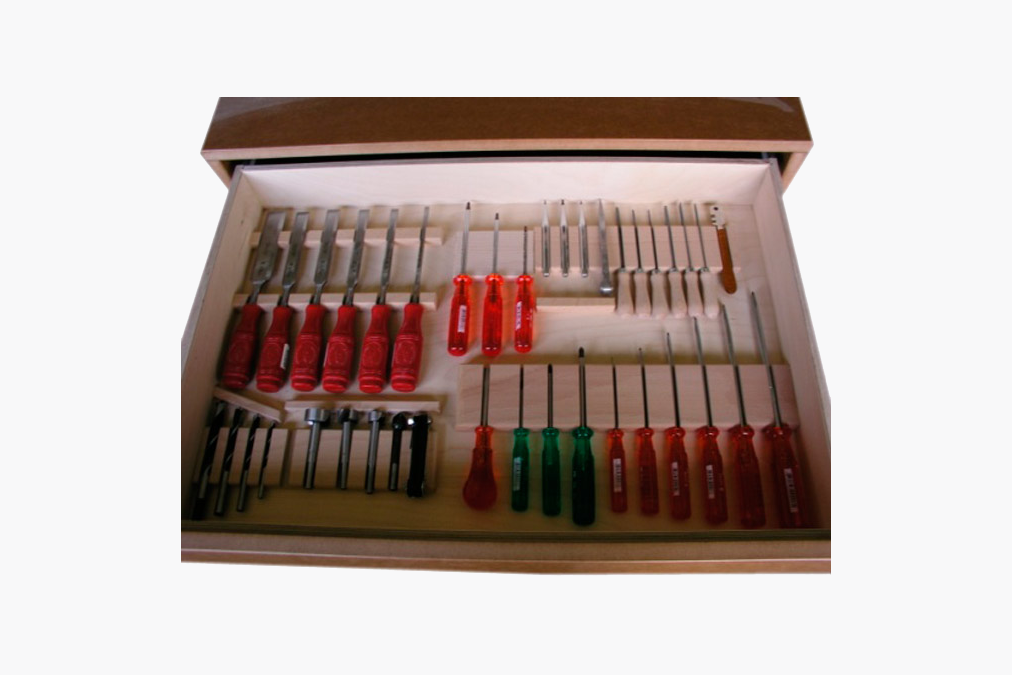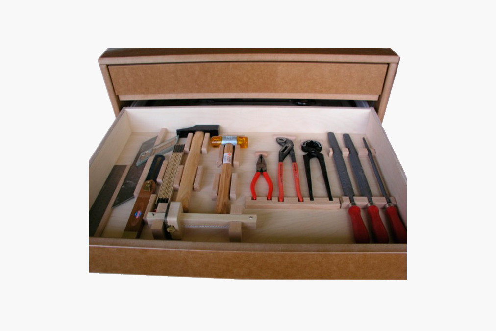 Der Bollmann Schubladenkasten ist insbesondere für Schreinerwerkstätten geeignet. Der Einbau erfolgt stirnseitig unter der Bollmann Hobelbank. Der Kasten ist mit einer grossen, auf Kugellagern gleitend Schublade ausgestattet. Er bietet eine optimale Platzausnützung, ein ausgereiftes Unterbringungssystem für die schonende Aufbewahrung der Werkzeuge und ist mit einem Kaba-Zylinderschloss verschliessbar.